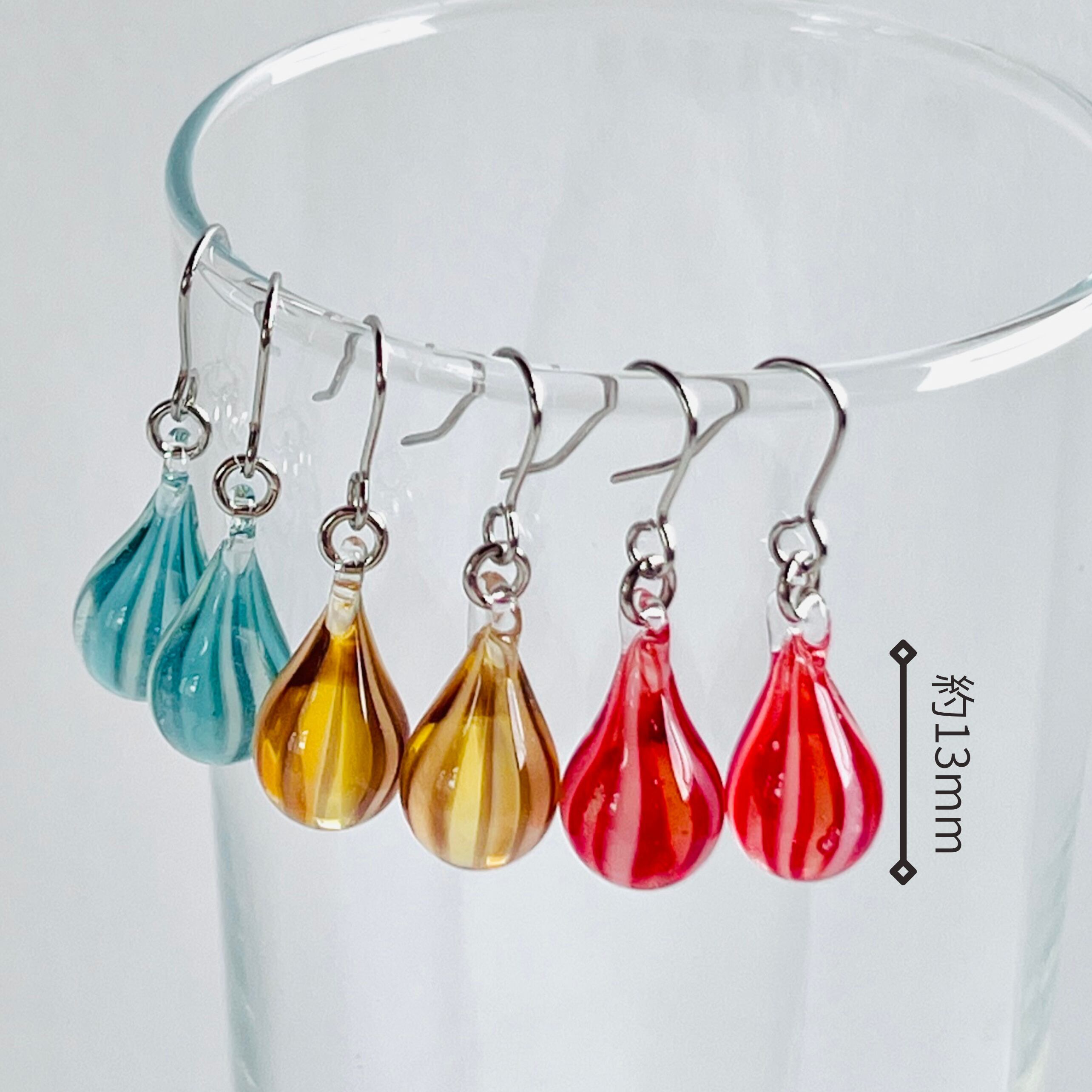 レトロなステンドグラスに似た趣のガラスの雫ピアスです。