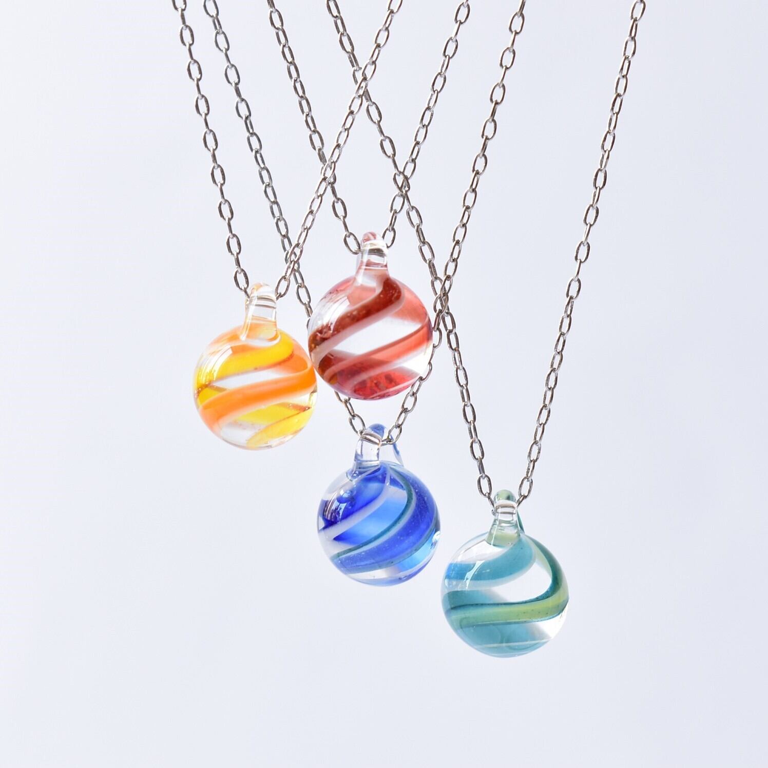 巻きリボンのような模様のシンプルなガラス玉のネックレスです。