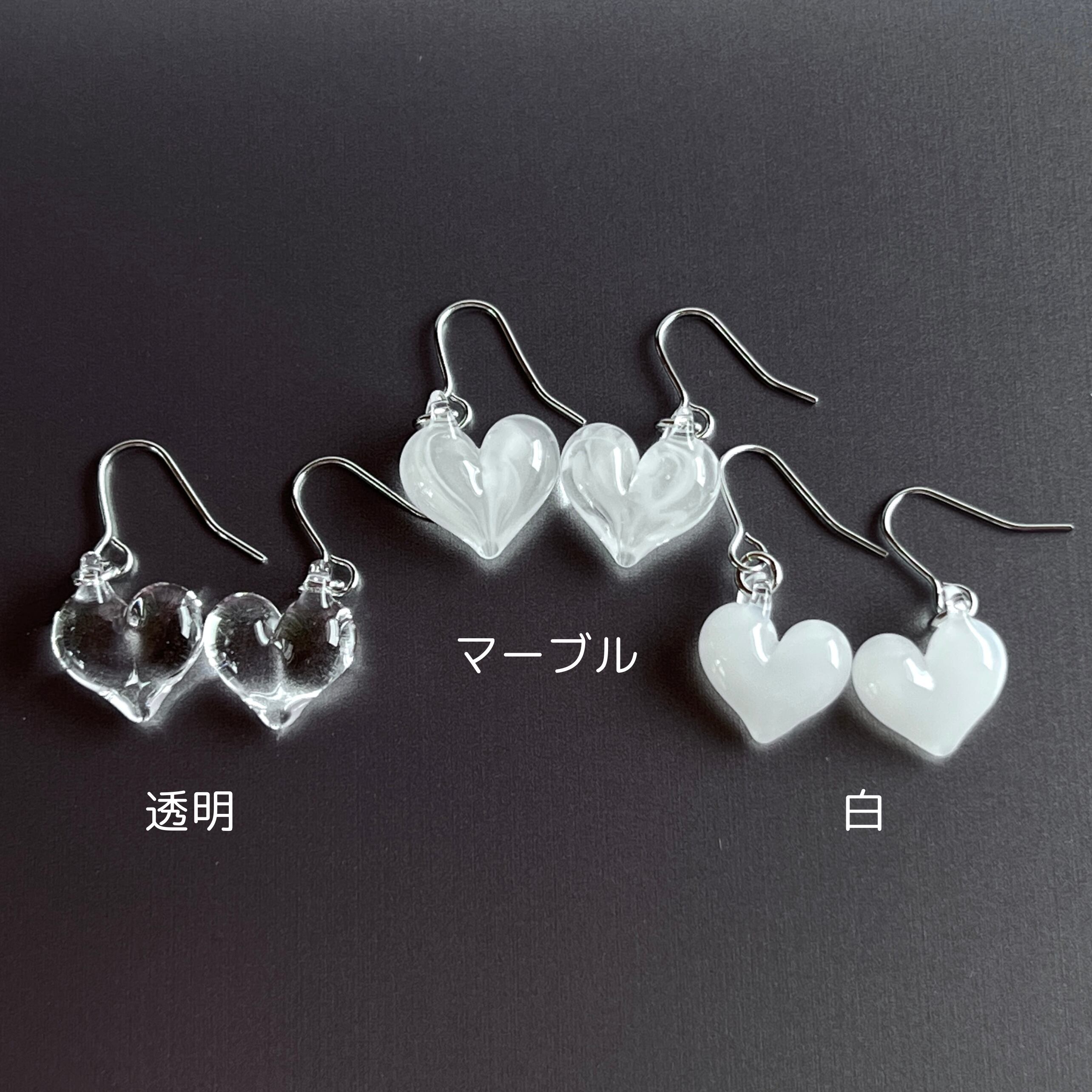 ガラスのハートピアス(透明、マーブル、白)
