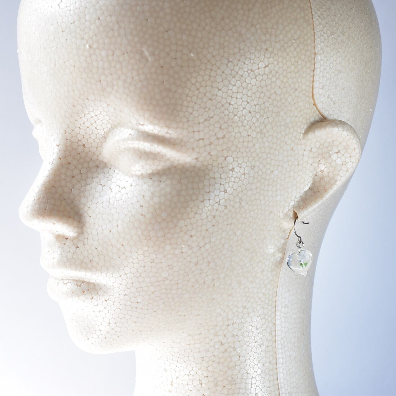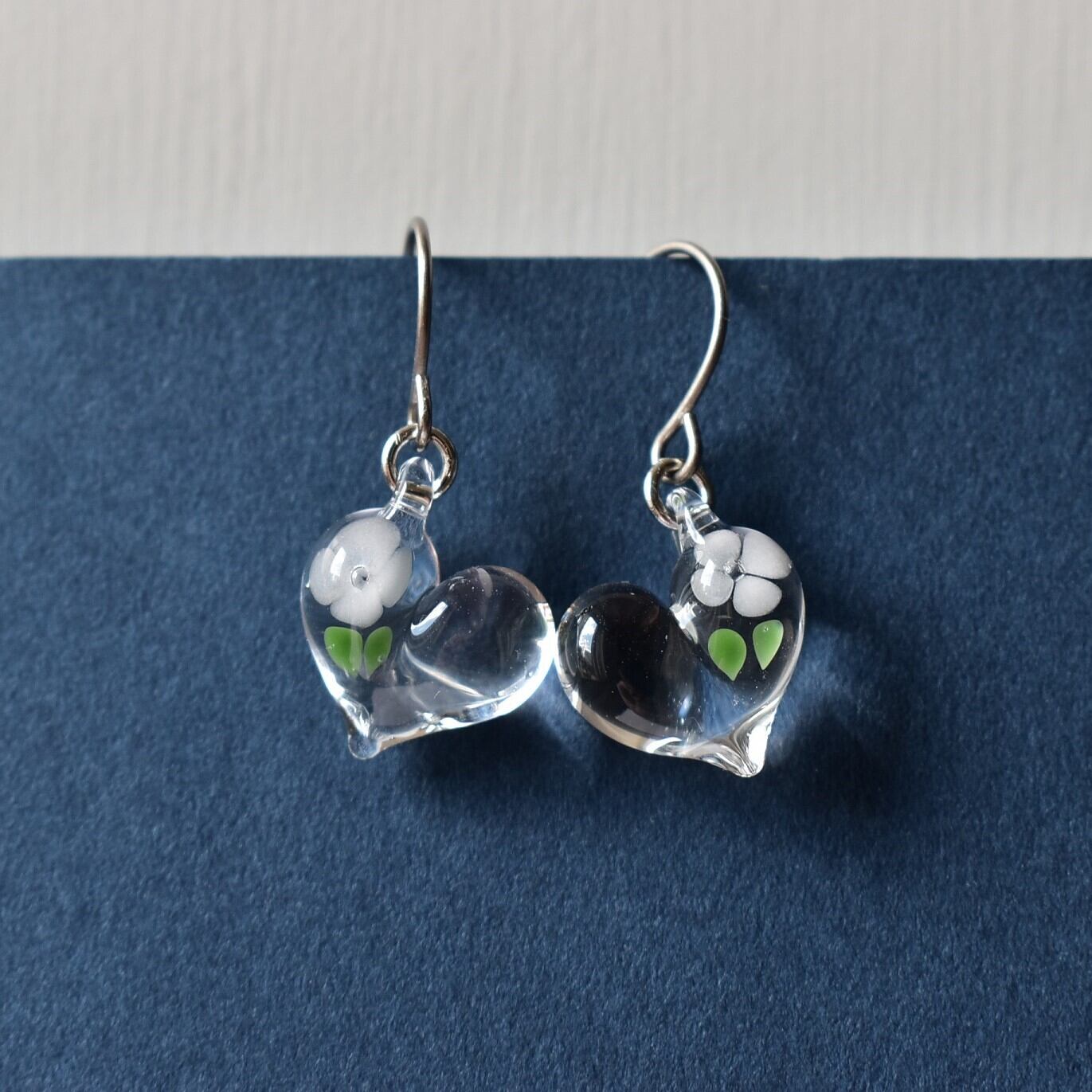ぷっくりとした可愛らしいガラスのハートに、昔ながらのとんぼ玉によく用いられるガラス工芸の技法「点打ちの花」をあしらいました。